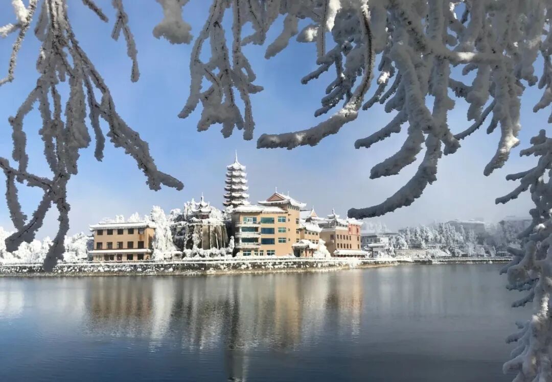 「海拔1230米的云中湖」是九宫山的主要景点之一,雪后的景象令人惊叹。湖面冰封玉砌,宛若明镜,倒映着四周的雪峰和玉树。