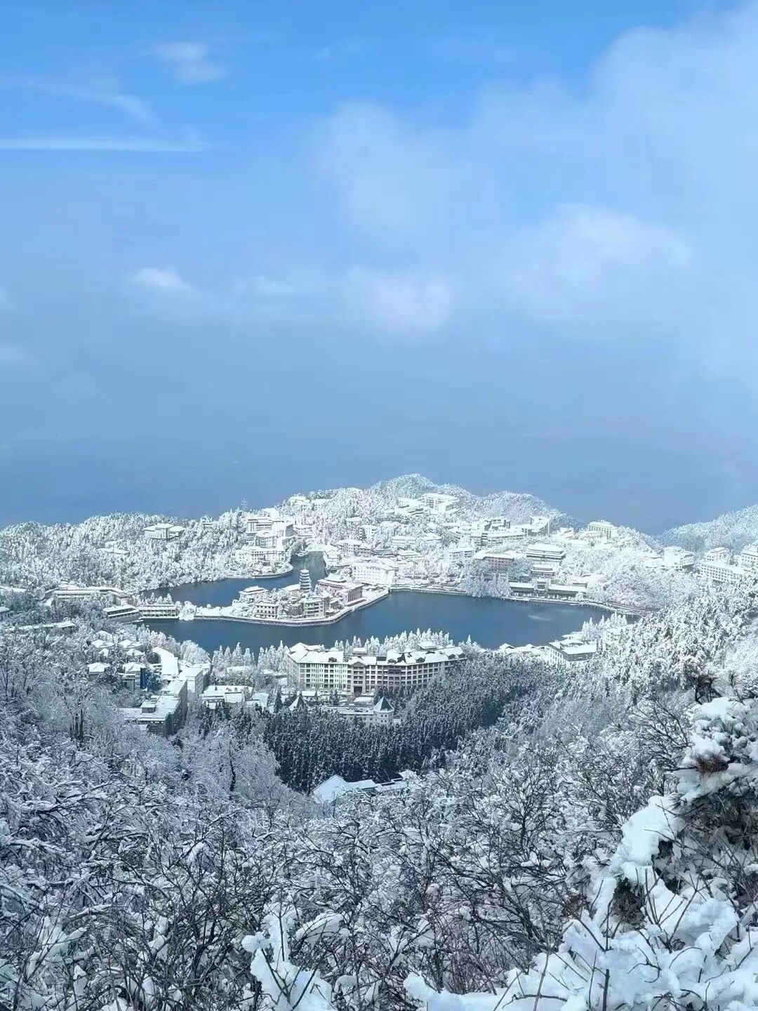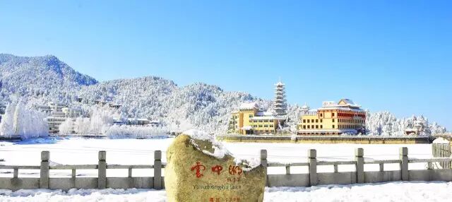 「海拔1230米的云中湖」是九宫山的主要景点之一,雪后的景象令人惊叹。湖面冰封玉砌,宛若明镜,倒映着四周的雪峰和玉树。