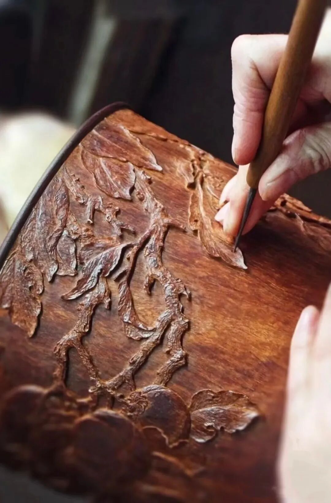 通山木雕:在非遗传承人手把手指导下,雕刻一件专属的竹艺作品。