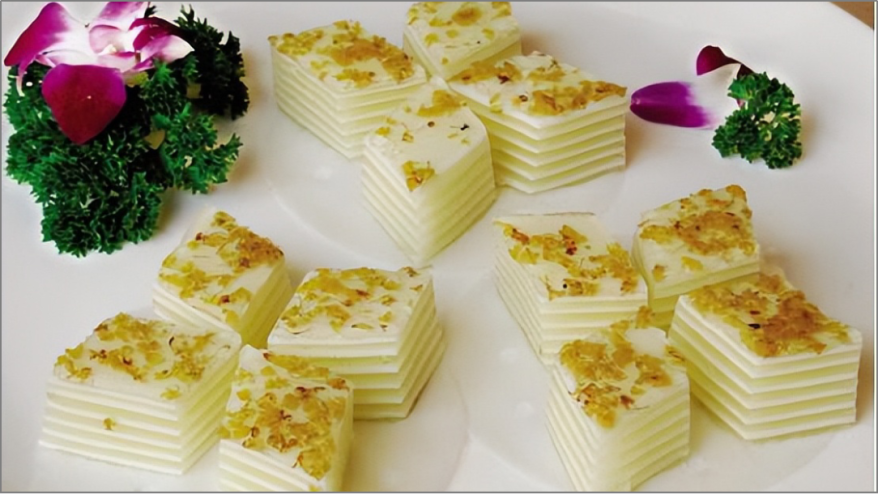 咸宁桂花糕是咸宁咸安区的一道特色名吃,其创制于明朝末期,以糯米粉、糖和蜜桂花为原料制作而成,历史悠久,美味爽口,做法简单,种类多样,入口化渣,口味清香。